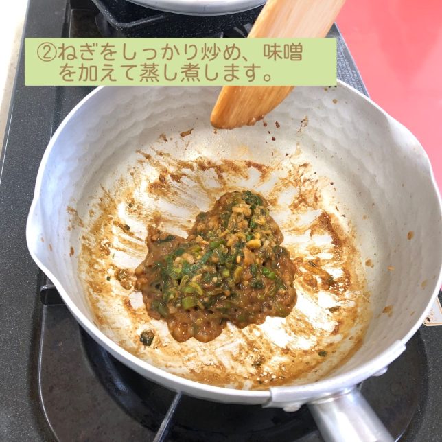 ねぎをしっかり炒め、味噌を加えて作ります。