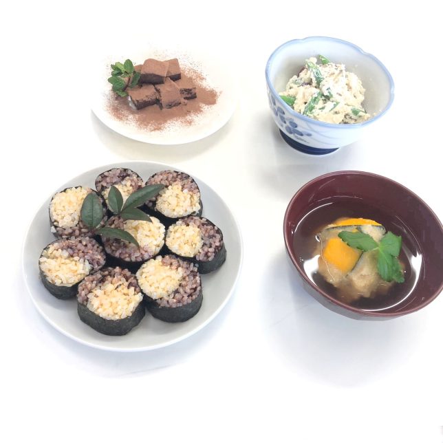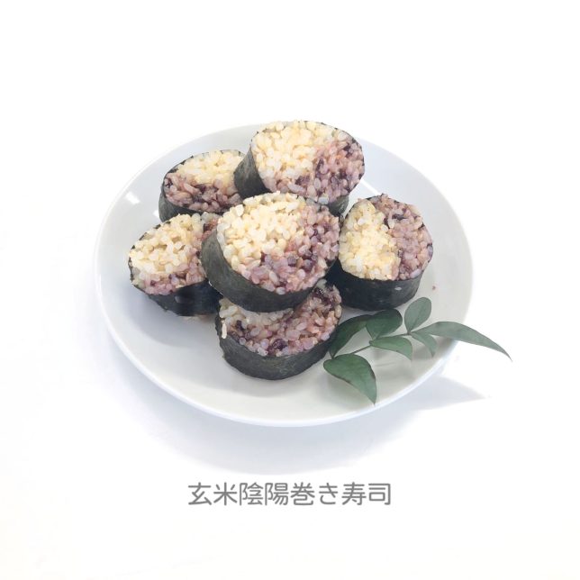 玄米ごはんに白ごま、塩を混ぜた「白」と、紫米入り玄米ごはんに梅干しを混ぜた「紫」のごはんで陰陽マークのお寿司を作りました。