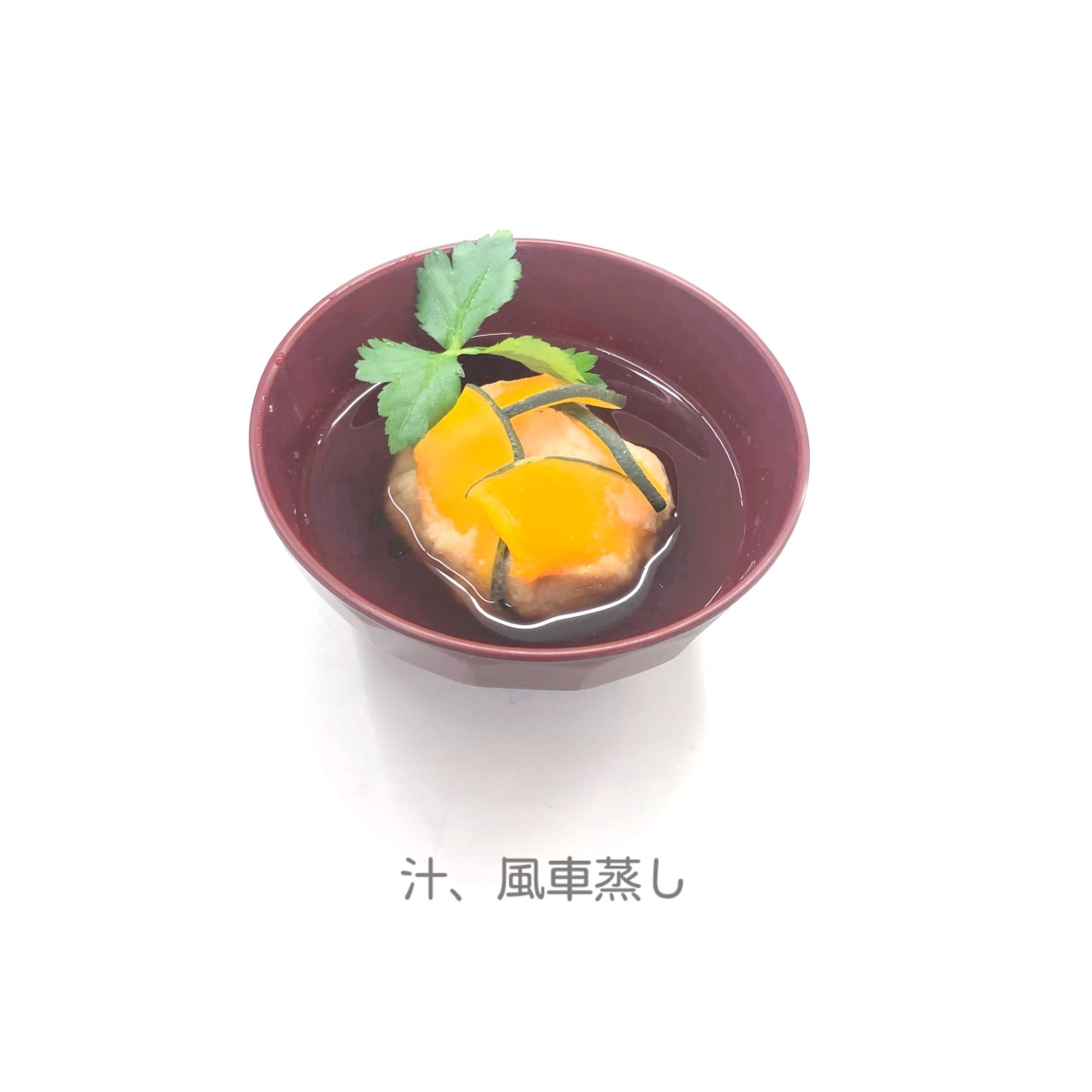 かぼちゃで風車を作り、卯の花と山芋の生地を中に入れて蒸したものを椀種にして、汁を張りました。