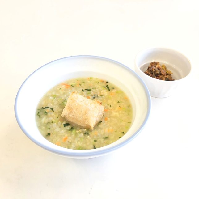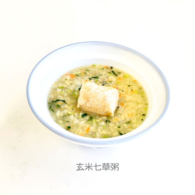 春の七草と小松菜、にんじんをみじん切りにしてごま油で炒め、玄米粥に加えて煮ました。